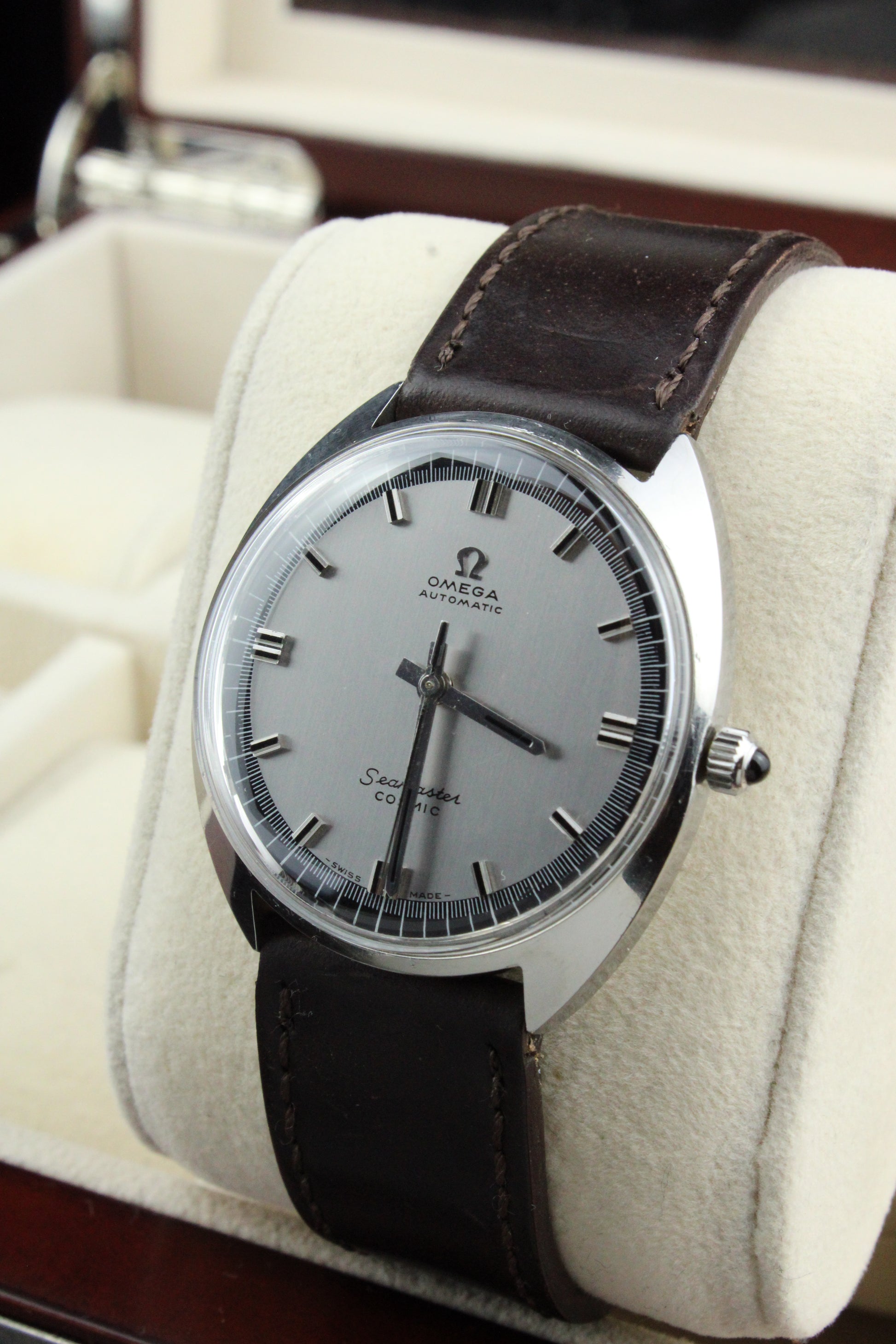 A razor-clean classic, this Seamaster Cosmic pairs a luminous silver dial with sharp black markers and hands, giving it a striking, high-contrast look that’s both refined and bold. The brushed tonneau steel case curves seamlessly around the wrist, showcasing that sleek late-’60s Omega design language. Inside, the automatic Cal. 552 delivers smooth, reliable precision. Elegant, confident, and effortlessly stylish — a vintage Omega that turns simplicity into pure allure.