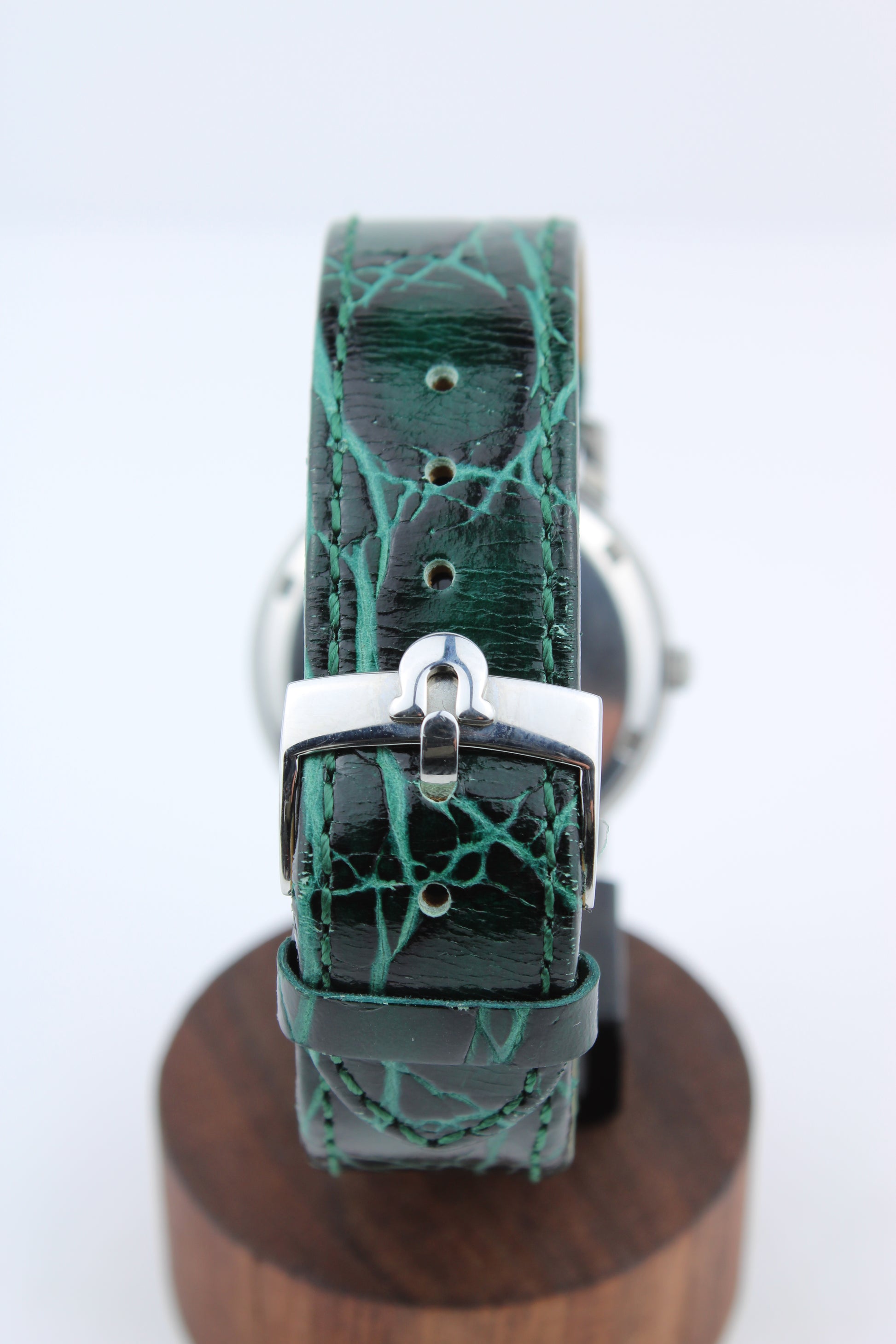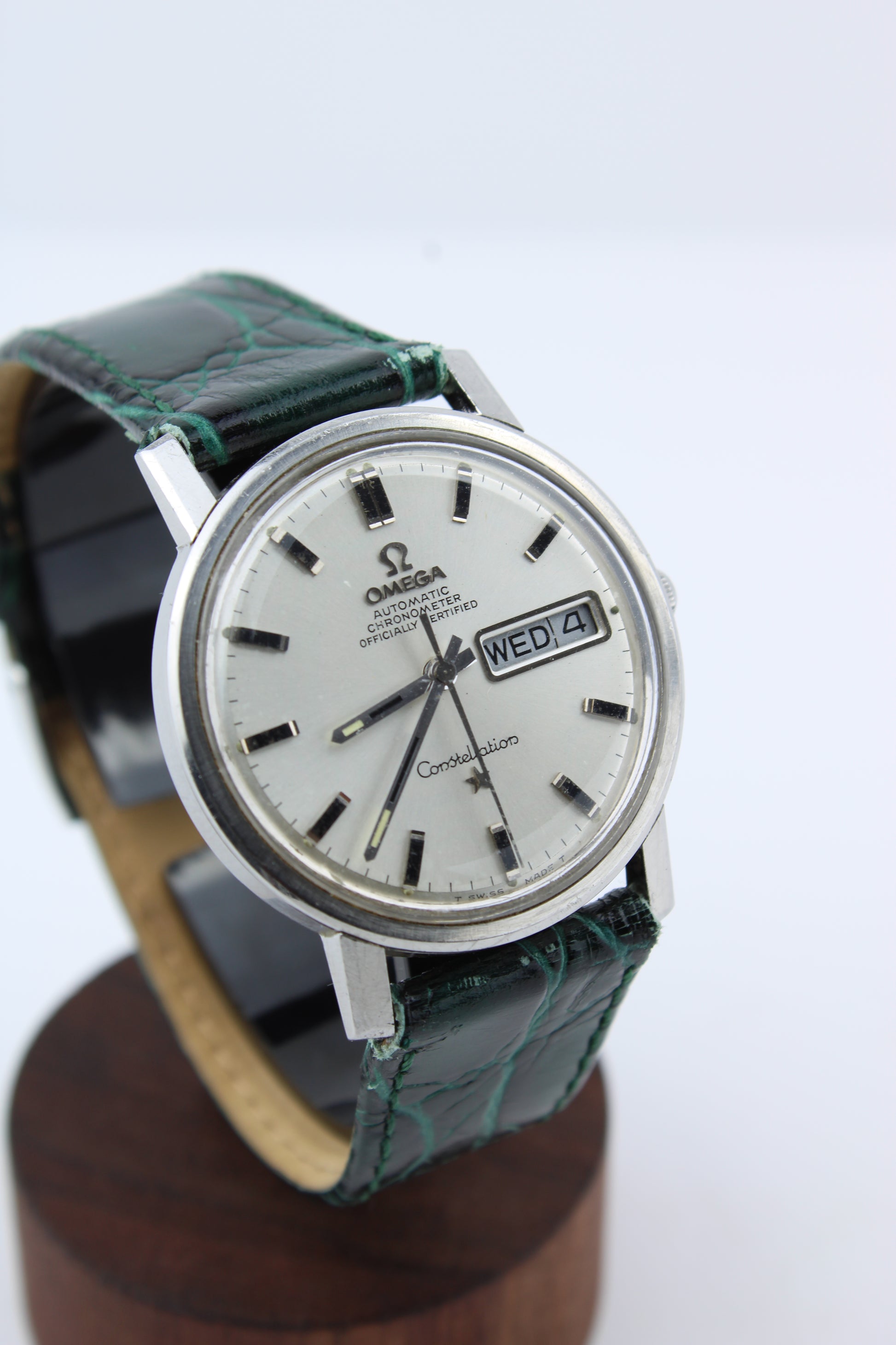The Omega Constellation Day-Date ref. 168.016 is a stainless-steel automatic chronometer wristwatch produced in the late 1960s to early 1970s. It is powered by the Omega Caliber 751, a 24-jewel, chronometer-certified movement featuring day and date indications at 12 o’clock. The watch has a 36 mm monocoque case with the signature Constellation observatory medallion on the caseback.
