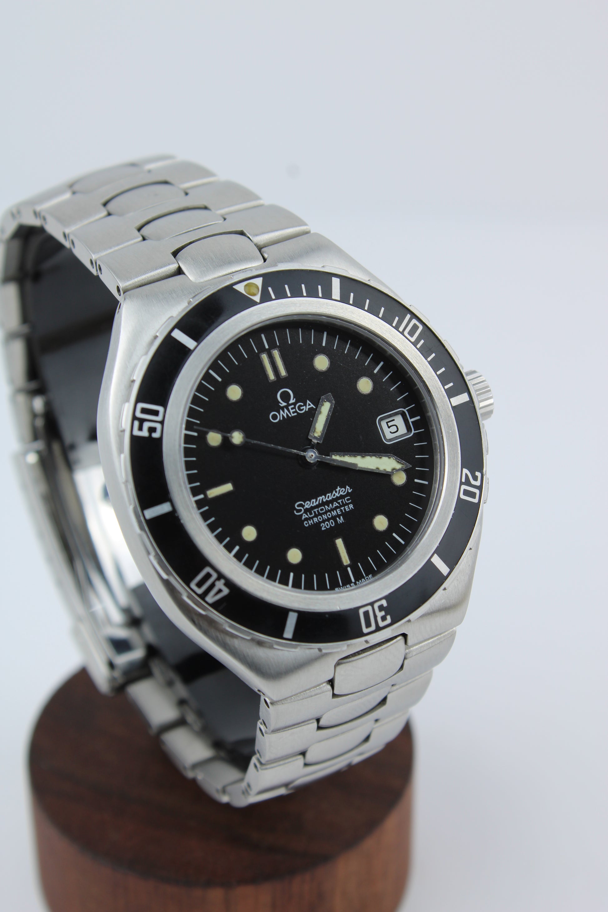 The Omega Pre Bond Seamaster 200m Automatic Fullsize 368.1051 is a vintage 1980s–1990s stainless steel dive watch from the Seamaster 200 “Pre-Bond” line, made before Omega’s official James Bond partnership. It has a 39 mm stainless steel case, black dial with luminous markers and sword hands, unidirectional black bezel, and a date window at 3 o’clock. The watch is powered by an automatic chronometer movement (Omega Calibre 1111 based on ETA 2892-2) with roughly 44 hours power reserve, fitted with a solid steel bracelet. It features a sapphire crystal and was originally rated 200 m water resistance.